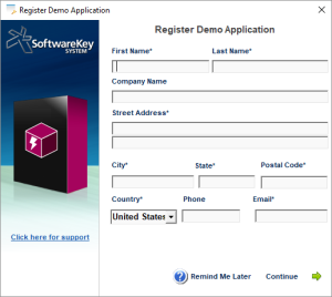 Allowing registration with Instant Protection PLUS 3 is entirely optional. There are many options for registering such as requiring registration before allowing the user to run the application, or opening the customer's web browser to a registration web page rather than use the registration dialog. More options can be found in the Customer Registration Options topic.
