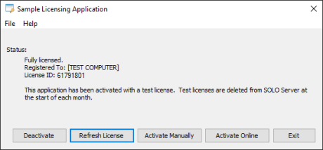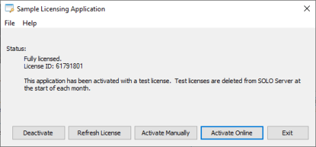 To activate the Sample Licensing Application automatically using SOLO Server, click on Activate Online.